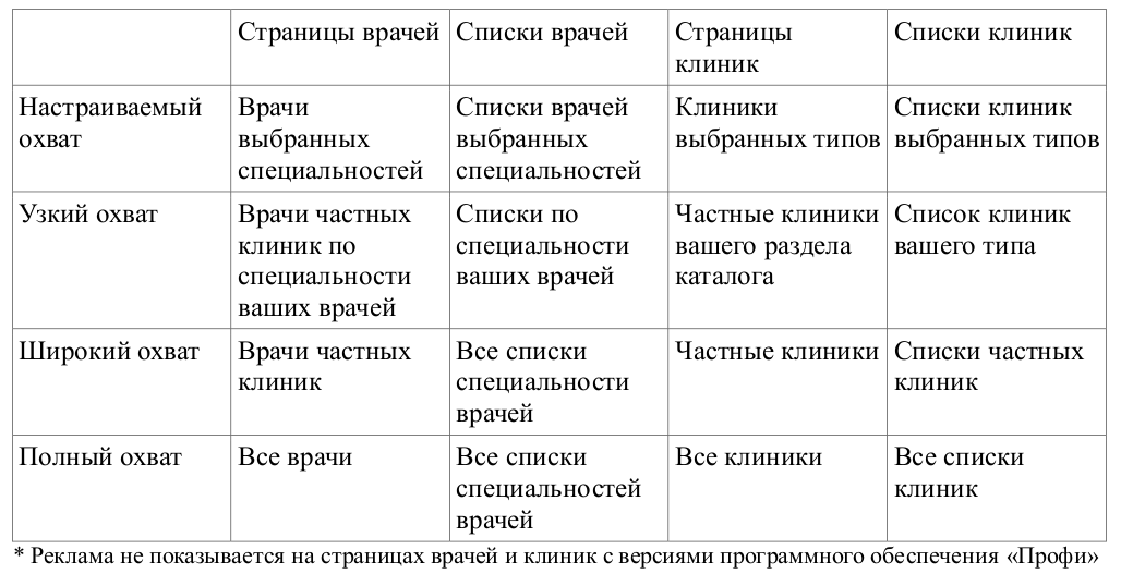 - «Таргетинг по интересам» аудитории предлагается на выбор рекламодателя - все посетители, широкий охват, узкий охват и настраиваемый. По умолчанию система предлагает наиболее эффективный для вашей клиники таргетинг, но исходя из целей рекламной компании вы можете выбрать любой другой. Стоимость такого таргетинга зависит от степени сужения аудитории и приведена на странице включения рекламной компании.