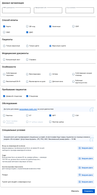 В блоке «Специальные условия» необходимо загрузить фото объекта для подтверждения наличия специальных условий. Фото появится на странице клиники вместе с указанием соответствующего пункта в разделе «Информация» после прохождения проверки и подтверждения.