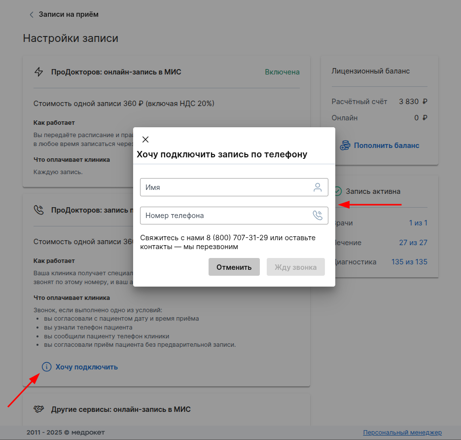 Чтобы пациенты могли записываться к вам через портал ПроДокторов, настройте онлайн-запись или запись по телефону в личном кабинете. Для этого подайте заявку на подключение и пополните баланс для оплаты услуг портала. Вы также можете добавить номера телефонов для получения смс-уведомлений о новых записях.