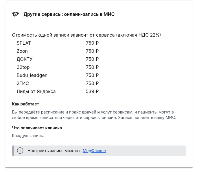 Данный вариант записи открывает доступ пользователям партнёрских сервисов к записи на приём. Клиника передаёт расписание и прайс врачей и услуг сервисам, а пациенты могут в любое время записаться через эти сервисы онлайн. Далее запись попадёт в вашу МИС. Стоимость записи с портала указана в верхней части информационного блока.