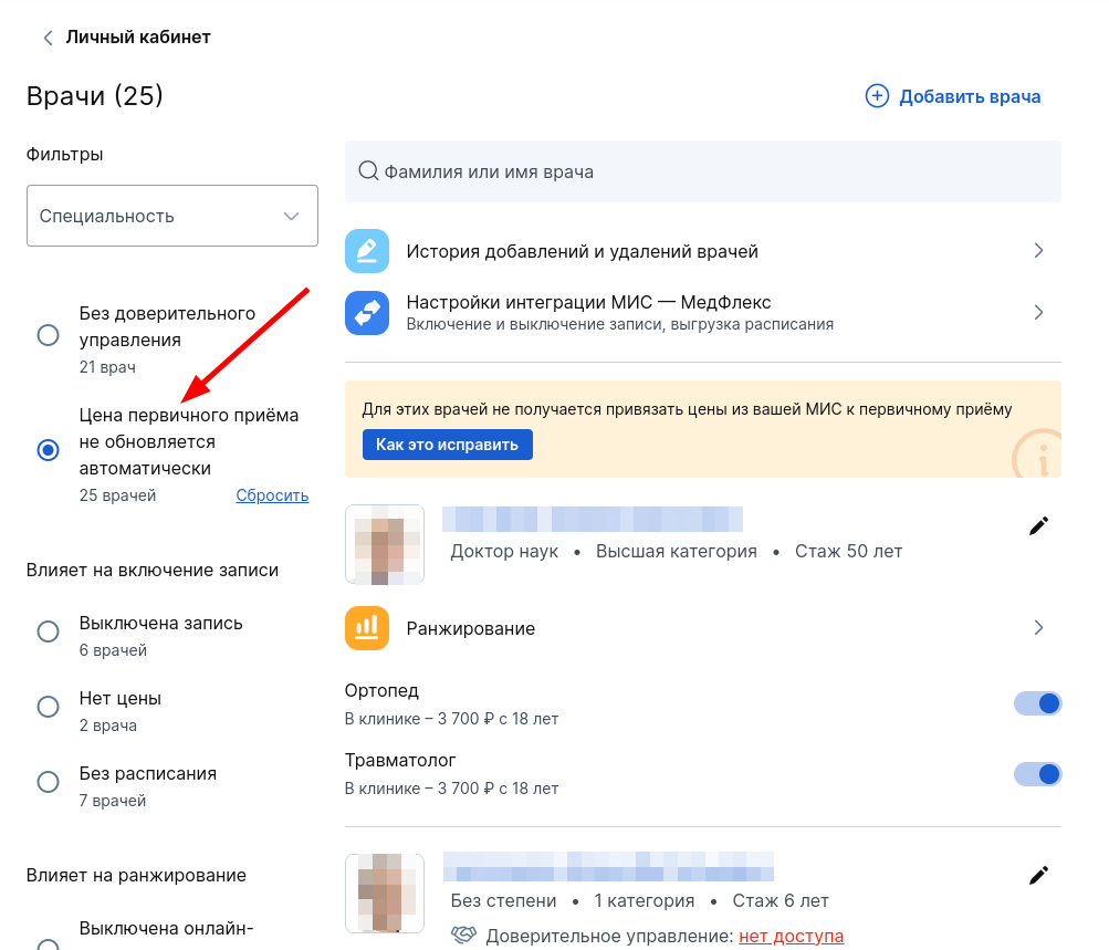 Как посмотреть список врачей с непривязанными ценами