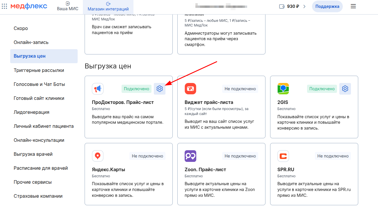 3. Настройте показ услуг в интеграции (если используете МедФлекс). Для этого в «Магазине интеграций» откройте «ПроДокторов. Прайс-лист» и для нужной категории выберите режим «Цена, расписание» — тогда на портале отобразятся и цены, и доступные слоты записи по этой категории. При необходимости включите/выключите запись на конкретные услуги внутри категории.