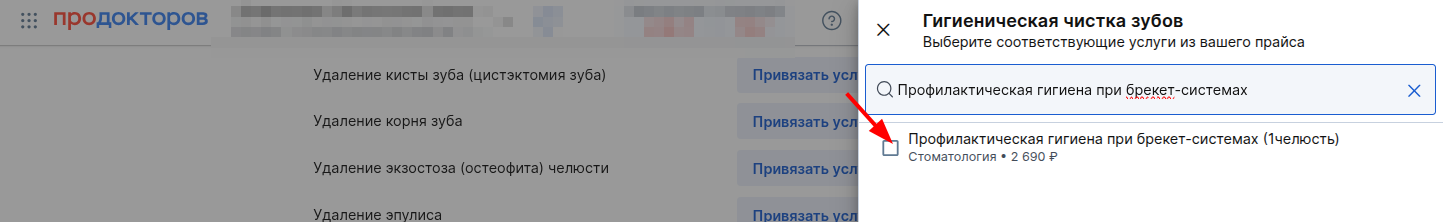 Важно! Обратите внимание, что привязываемые вами услуги из прейскуранта должны относиться именно к той услуге на портале, которую вы выбрали. Иначе неверно привязанная услуга может не выдаваться в поисковых запросах пациентов.
