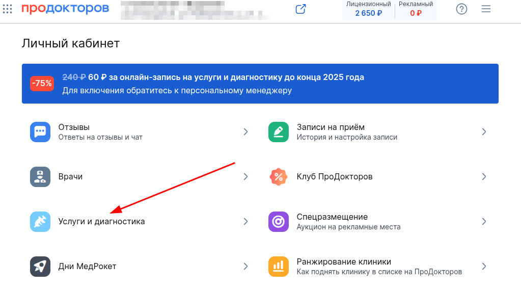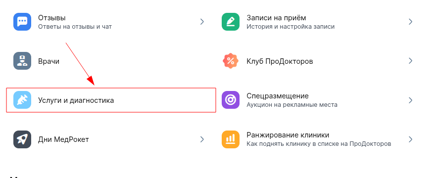 1. Для того чтобы привязать услуги из выгруженного прейскуранта на портале, перейдите в раздел «Услуги и диагностика» в личном кабинете клиники.