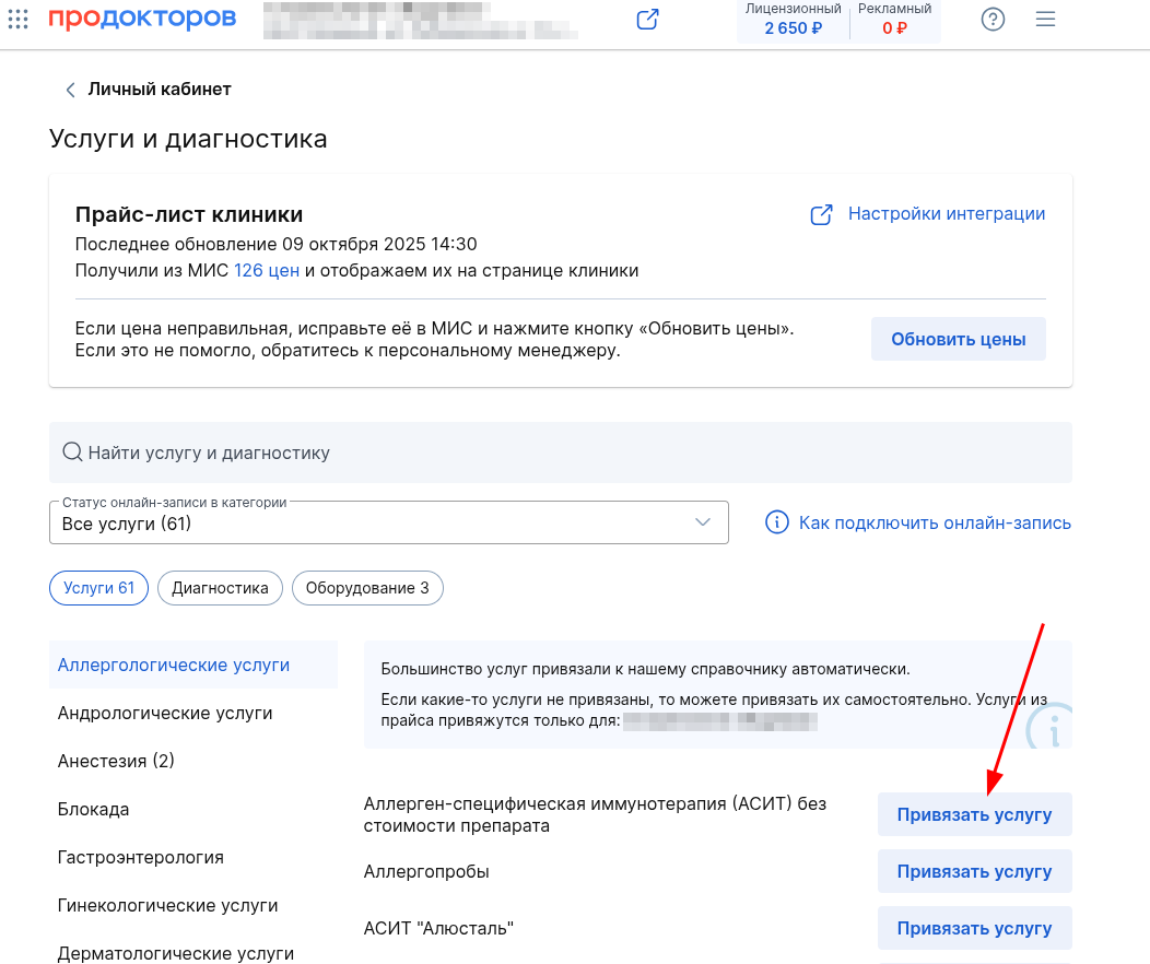 4. Привяжите услуги к категориям ПроДокторов. В разделе «Услуги и диагностика» выберите услугу → «Привязать услугу» → укажите соответствующую категорию на портале. Без этой привязки услуга и запись по ней не появятся в карточке врача.
