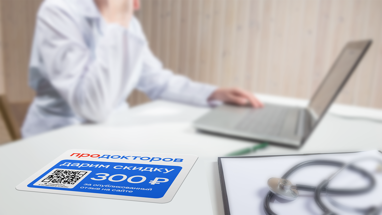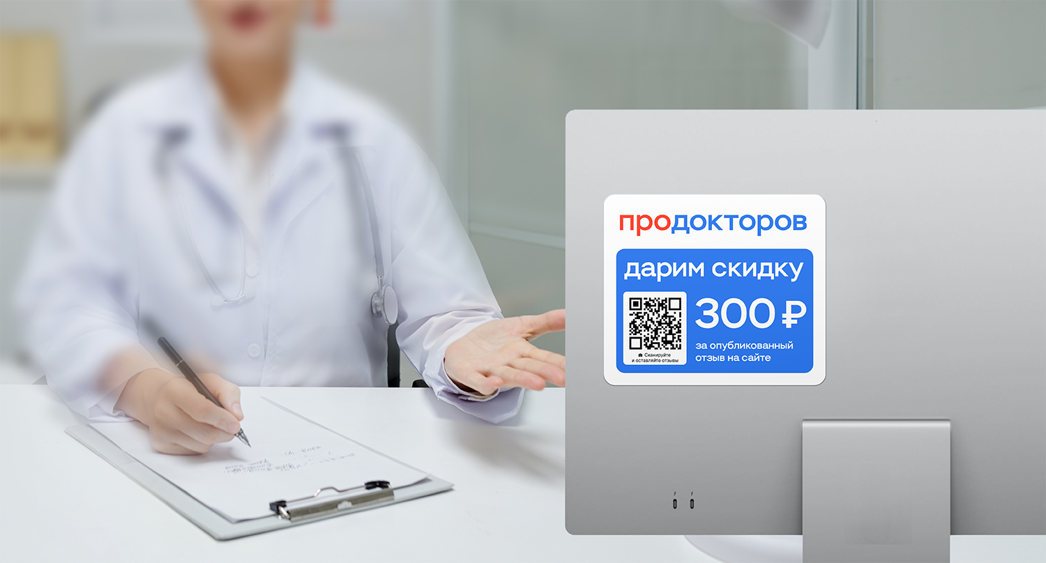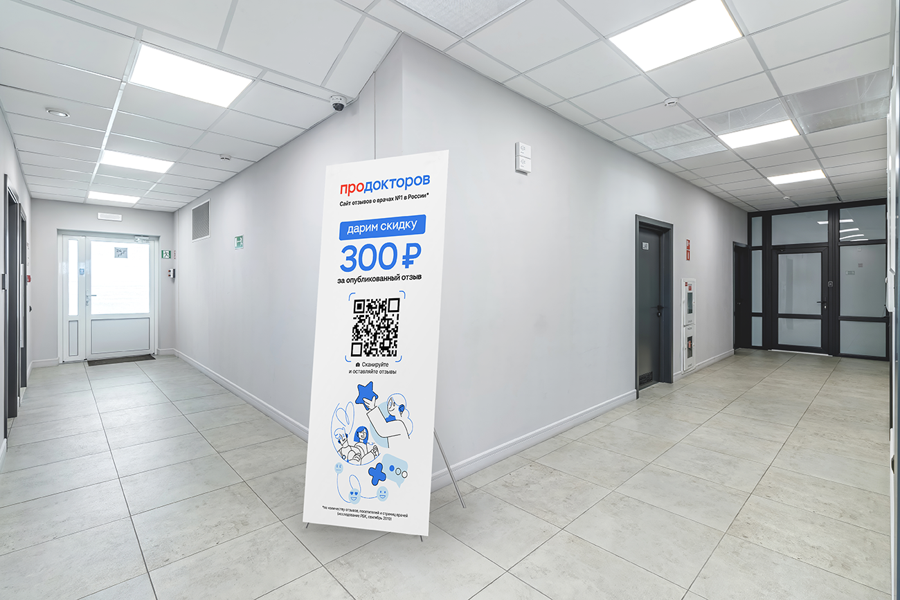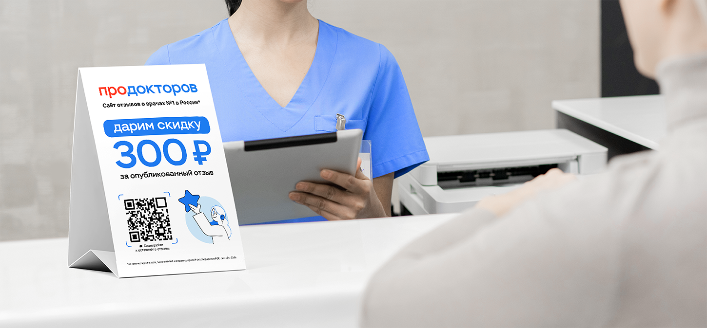 Клиника размещает у себя полиграфию ПроДокторов. Пациент может отсканировать QR-код и оставить отзыв о приеме через специальный сайт. За опубликованный отзыв клиника дарит пациентам промокод на 300 ₽: пациентам будет приятно получить скидку, и они обязательно вернутся, чтобы воспользоваться ей. Также клиника дополнительно бесплатно получит от ПроДокторов ПО Профи на 90 дней, когда активирует необходимое количество промокодов.