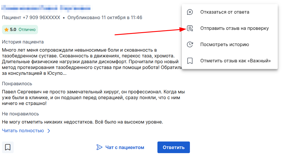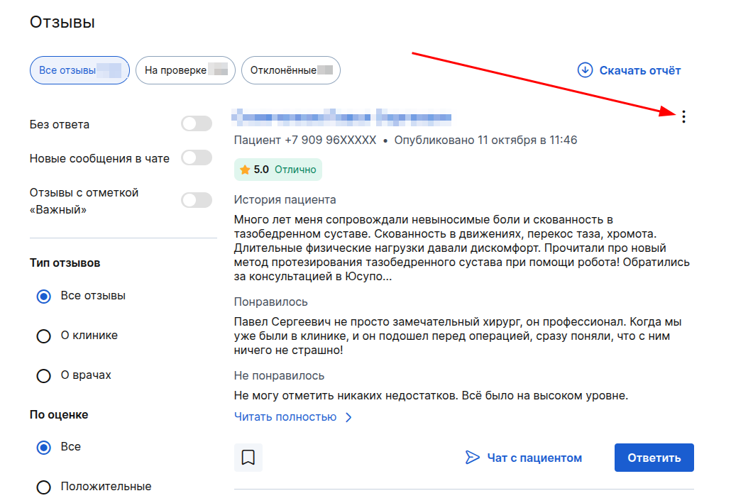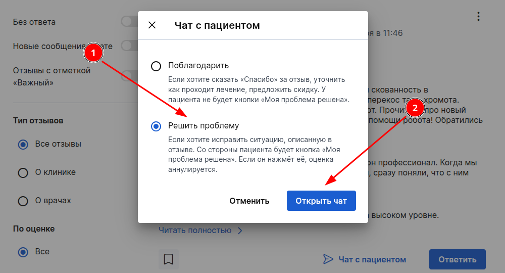 Приватный чат с пациентом: обсудить ситуацию напрямую. При выборе цели «Решить проблему» пациент может аннулировать оценку (рейтинг клиники восстанавливается), что зачастую снимает остроту ситуации без удаления текста. Подробнее в статье Приватный чат с пациентом.