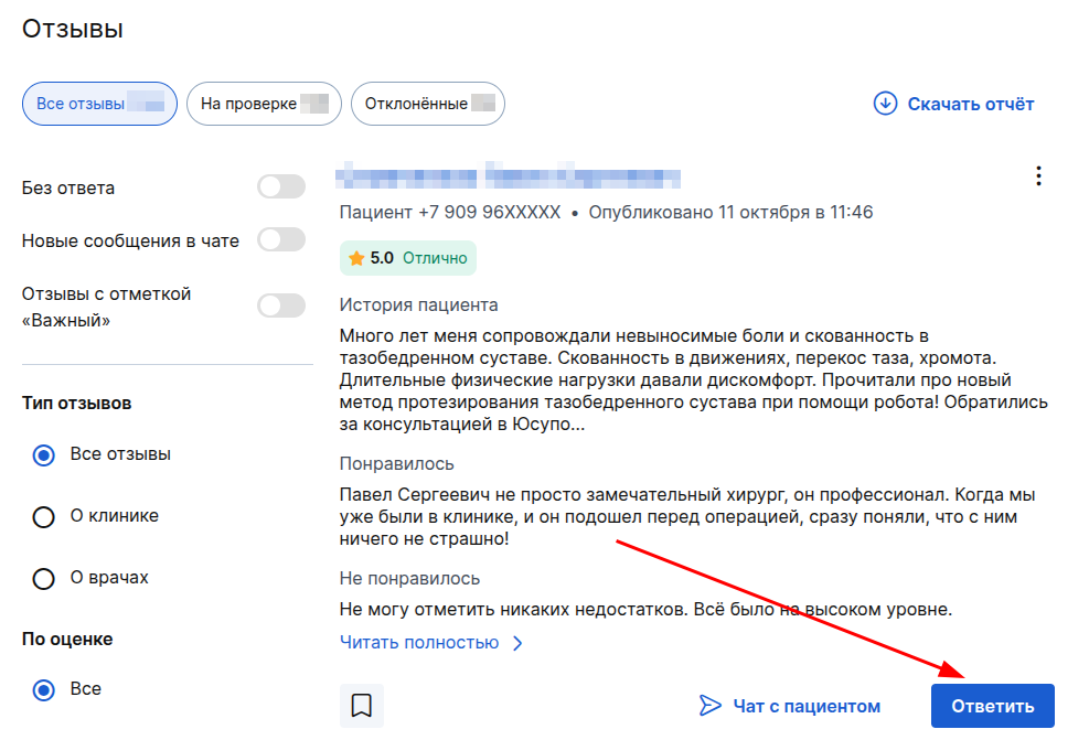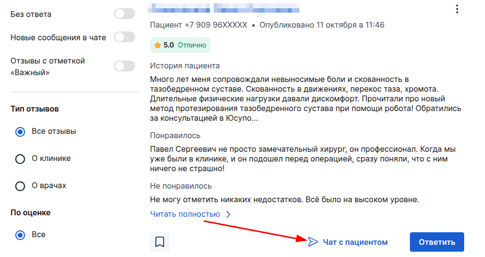 1. В разделе «Отзывы» нажмите кнопку «Чат с пациентом».