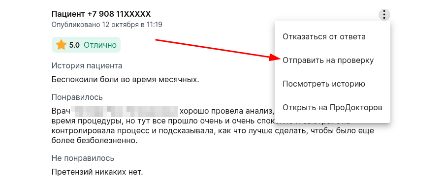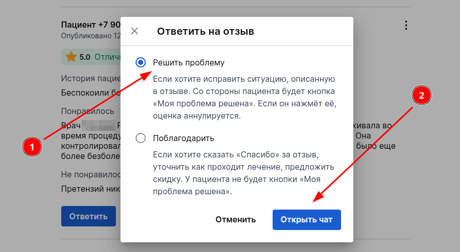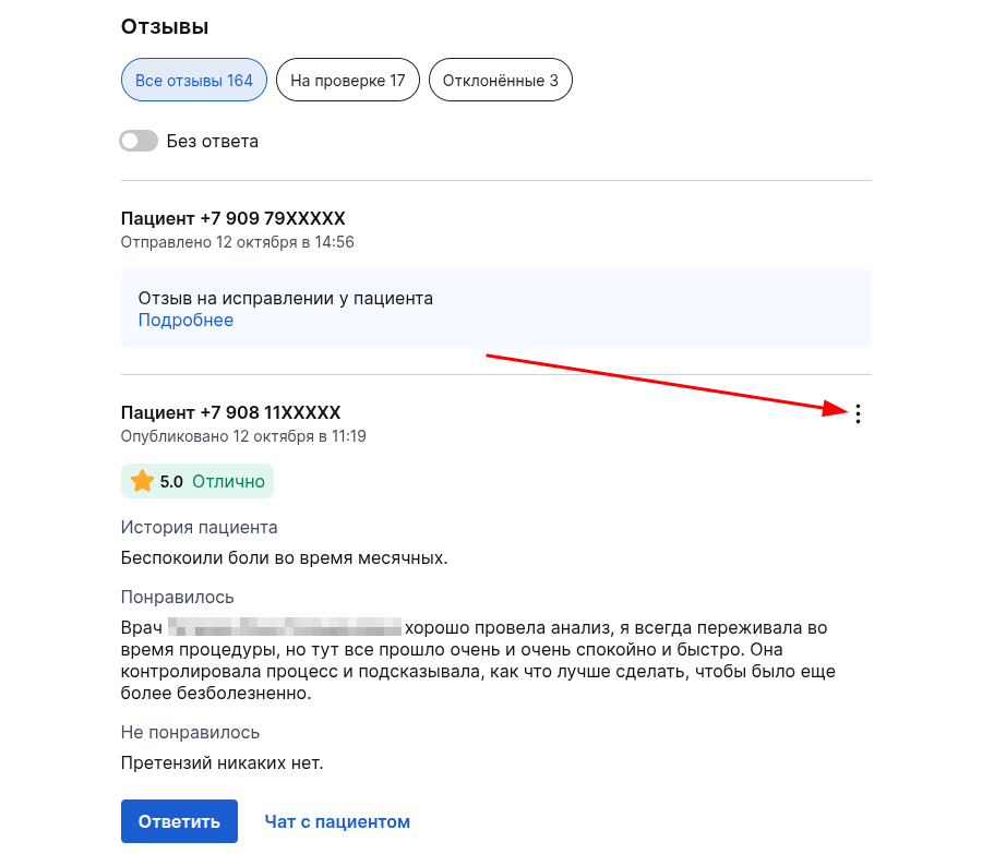 Приватный чат с пациентом: обсудить ситуацию напрямую. При выборе цели «Решить проблему» пациент может аннулировать оценку (рейтинг врача восстанавливается), что зачастую снимает остроту ситуации без удаления текста. Подробнее в статье Инструкция по приватному чату.