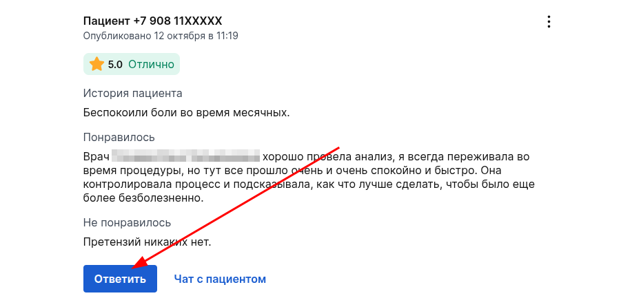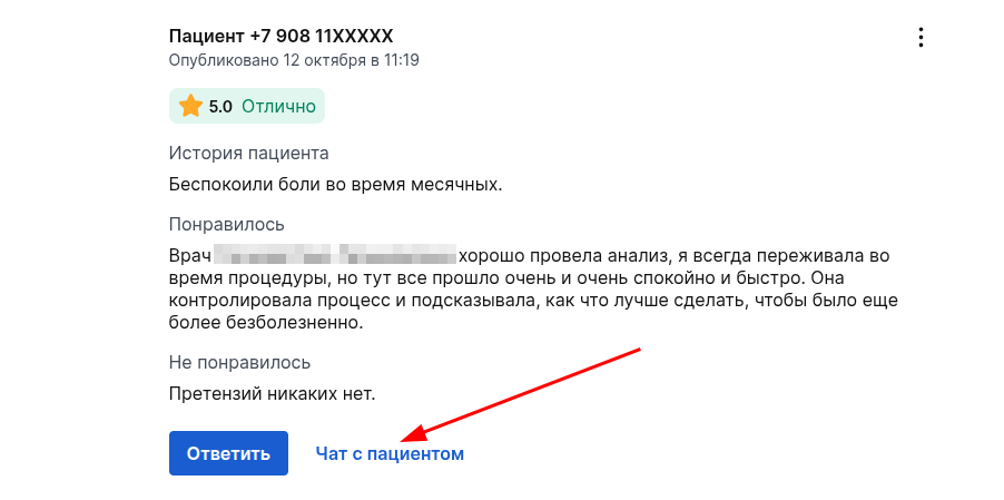 1. В разделе «Отзывы» нажмите кнопку «Чат с пациентом» рядом с нужным отзывом.